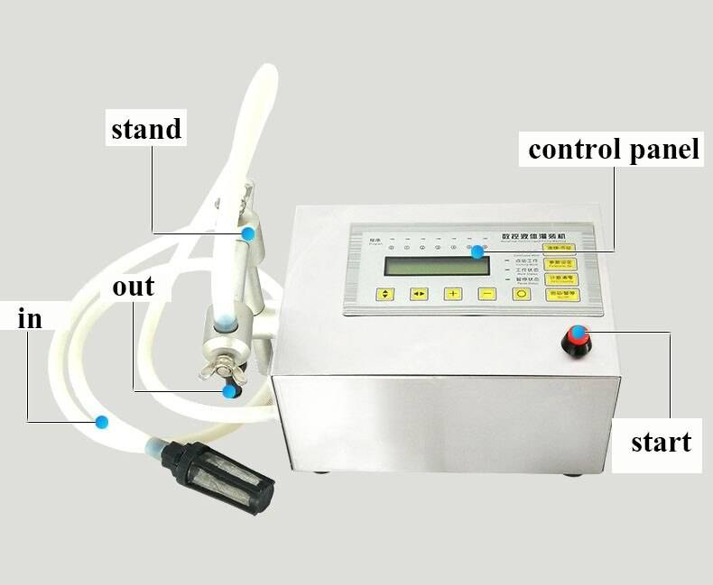 This numerical control liquid filling machine is compact and portable. The casing uses stainless steel so it is durable and easy to clean. The machine has a self-prime pump that can suck in the liquid from your container and then output via the nozzle. It can be used to fill many different types of clear thin liquid, including water, olive oil, fuel, drinks, vinegar, milk etc.